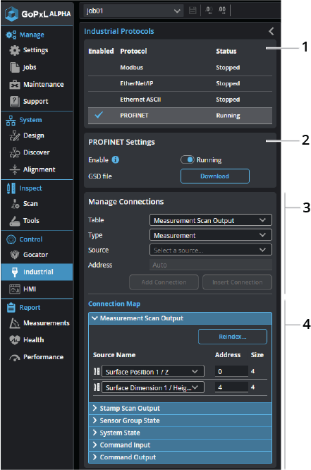 You configure the protocol on the Control > Industrial page. After configuring the PROFINET protocol in GoPxL (see below), use the information in PROFINET Protocol to configure your
