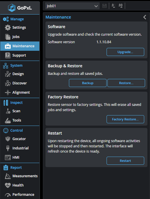 - Backup / Restore...: Back up and restore all saved jobs and recorded data. Note that backing up and restoring on a PC instance of GoPxL only affects the PC instance, not the sensor. For more information, see Backup and Restore.