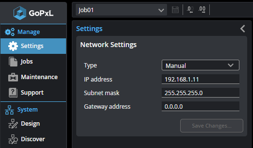The Settings page in the Manage category provides network settings. Settings must be configured to match the network to which the sensors are connected.