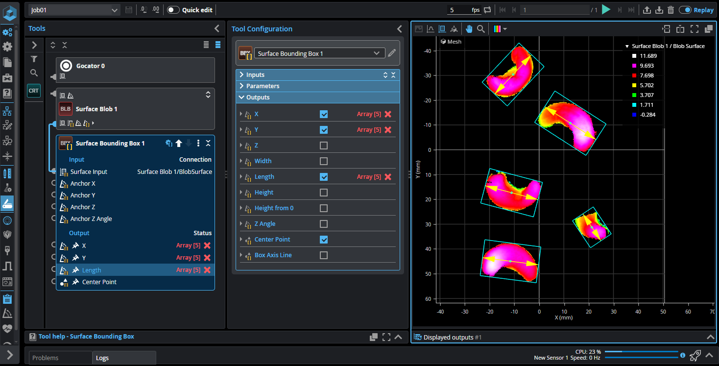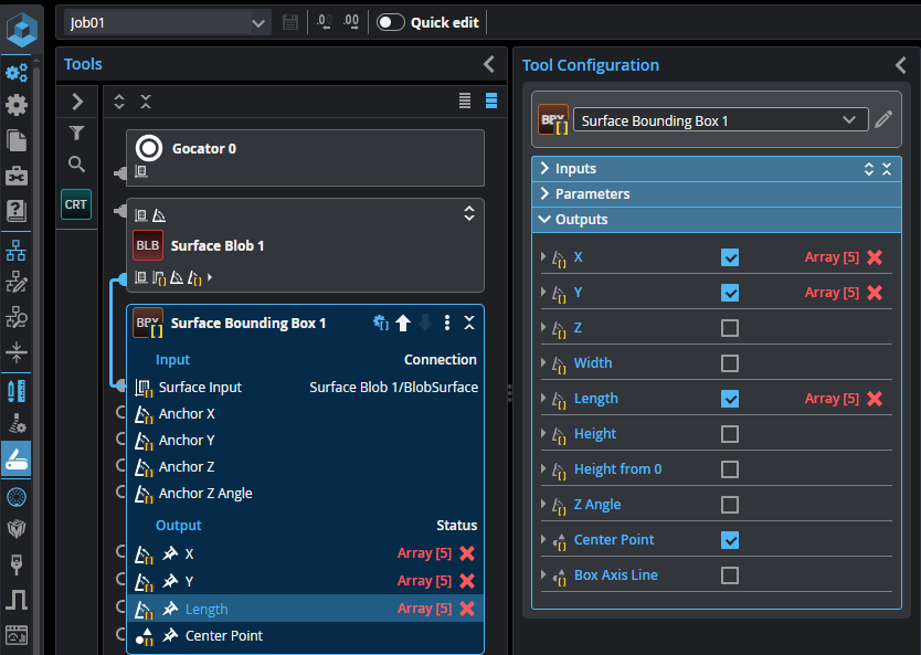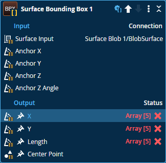 The following shows the Surface Bounding Box tool in batching mode (taking the Surface Blob tool's array of outputs as input). The tool calculates the bounding box for each element in the input array, and returns the enabled measurements as arrays. That is, it returns an X, Y, and Z measurement for each object.