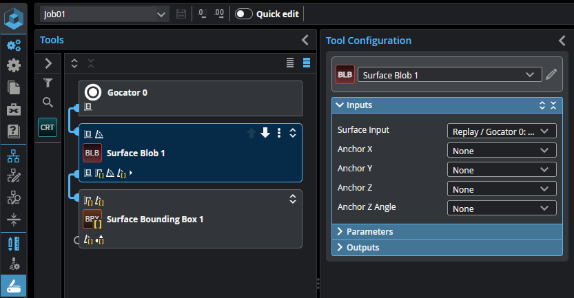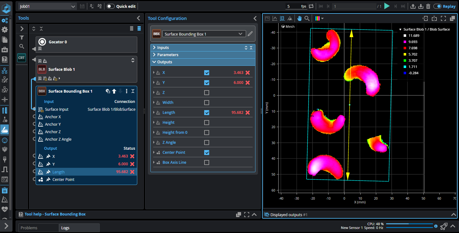 Surface Blob tool identifying blobs in scan data.