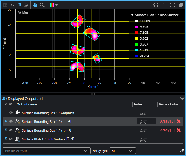 When you are working with arrayed outputs, you can select an array element for display across all arrayed outputs listed in the Displayed Outputs panel. For example, in the following, we see all five objects in an arrayed output displayed. For each element, Bounding Box tool graphics and X and Y measurements, as well as the Surface Blob output.