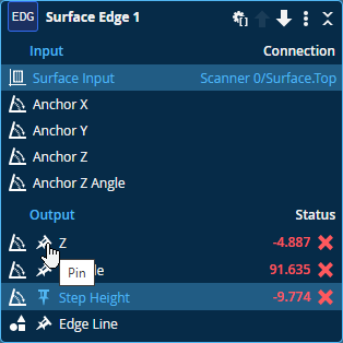 You can “pin” items in the Displayed Outputs panel so that it they are always displayed, even if you select a different tool, or another input or output in a tool block. Pinning items is useful for example if you want to monitor multiple, independent measurements while GoPxL is running in production. Pinning is also useful when setting up tools: you can change the parameters of a tool (such as a filter) earlier in a tool chain and immediately see the impact that change has on another tool (whose output is pinned) later in the chain. This minimizes toggling and clicking between tools and measurements.