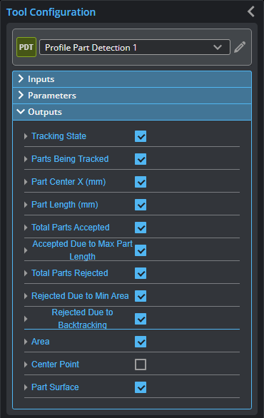 In addition to a Part Surface output, the tool also returns the Point geometric feature of center of the detected part, and several measurement tool that you can use as diagnostics (for example, to see the number of parts accepted, the number of parts rejected and why, the part's length, and so on). For a complete list of the diagnostics, see below.