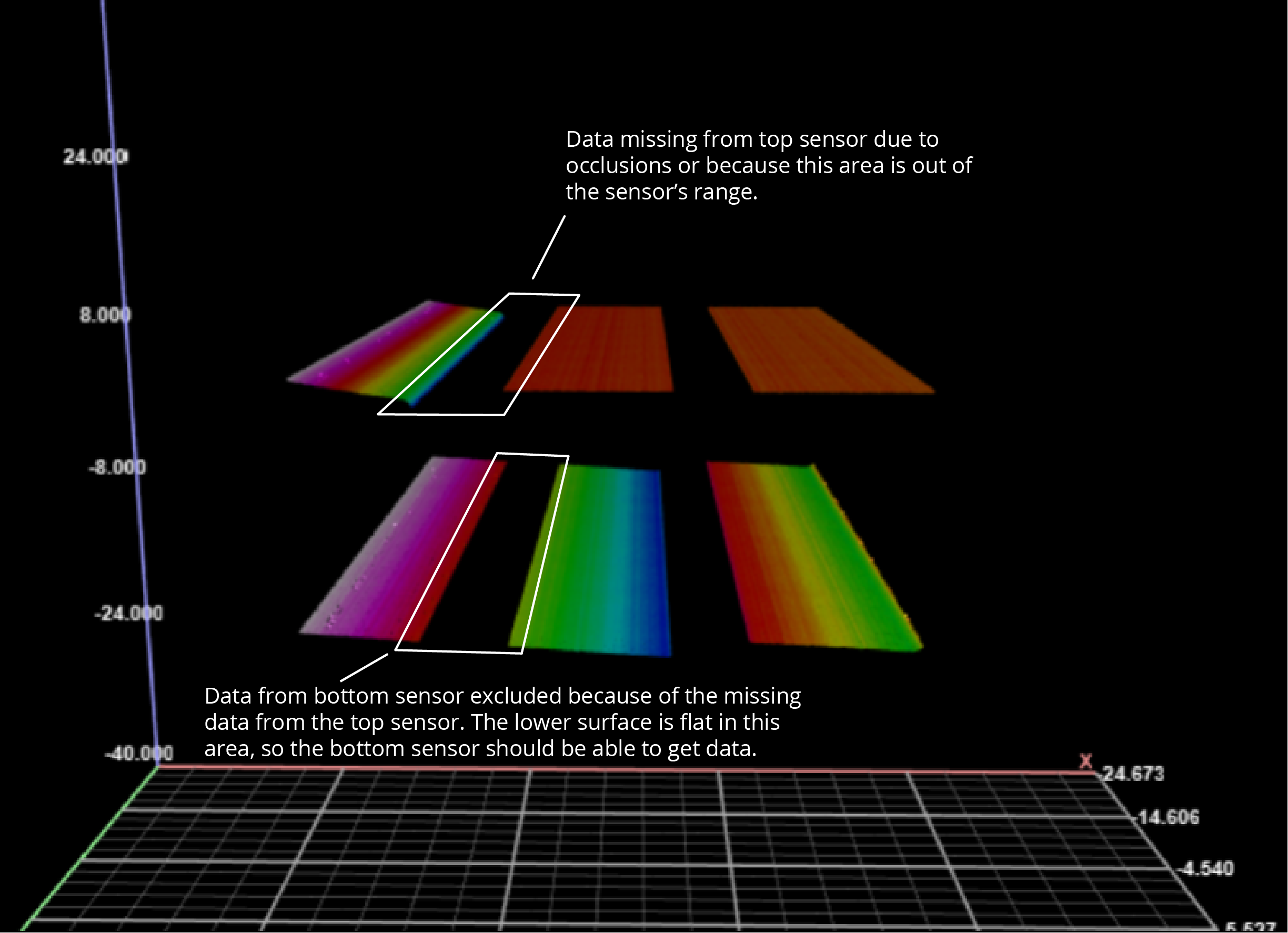 The data on the upper left is missing, due to the shape of the target: getting data from this area is difficult or impossible, due to occlusions or simply because this part of the upper surface is beyond the top sensor's measurement range. Data is missing on the left of the lower surface, even though the target is flat in this area. In the following image, Include one-sided data is enabled. The result is that data from the lower left is included in the scan data, better representing the actual target. (The same situation is occurring on the right side of the surfaces.)