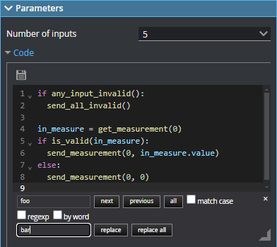 The Python code the tool runs. Supports expanding and collapsing of code blocks. You can resize the editor vertically with the grabber to the lower left of the editor. You can resize the width of the editor by resizing the Tool Configuration panel. The following keyboard shortcuts are available in the editor. Ctrl-S: Saves the script. The tool checks the syntax. Use Cmd-S on macOS. Ctrl-F: Opens a search and replace panel. The search and replace panel supports regular expressions. Use Cmd-F on macOS. To close the panel, click the "x" to the upper right.
