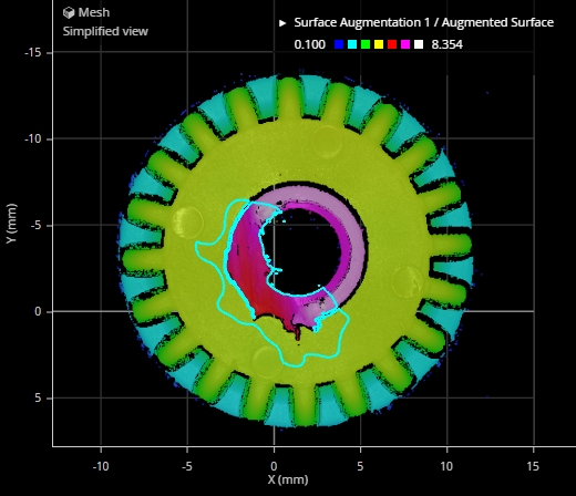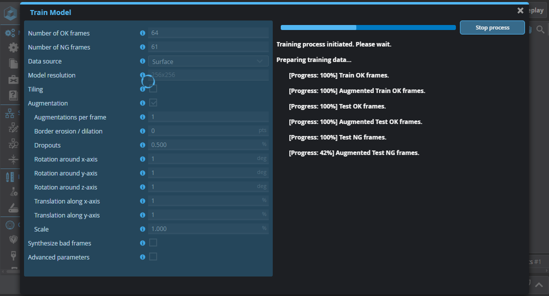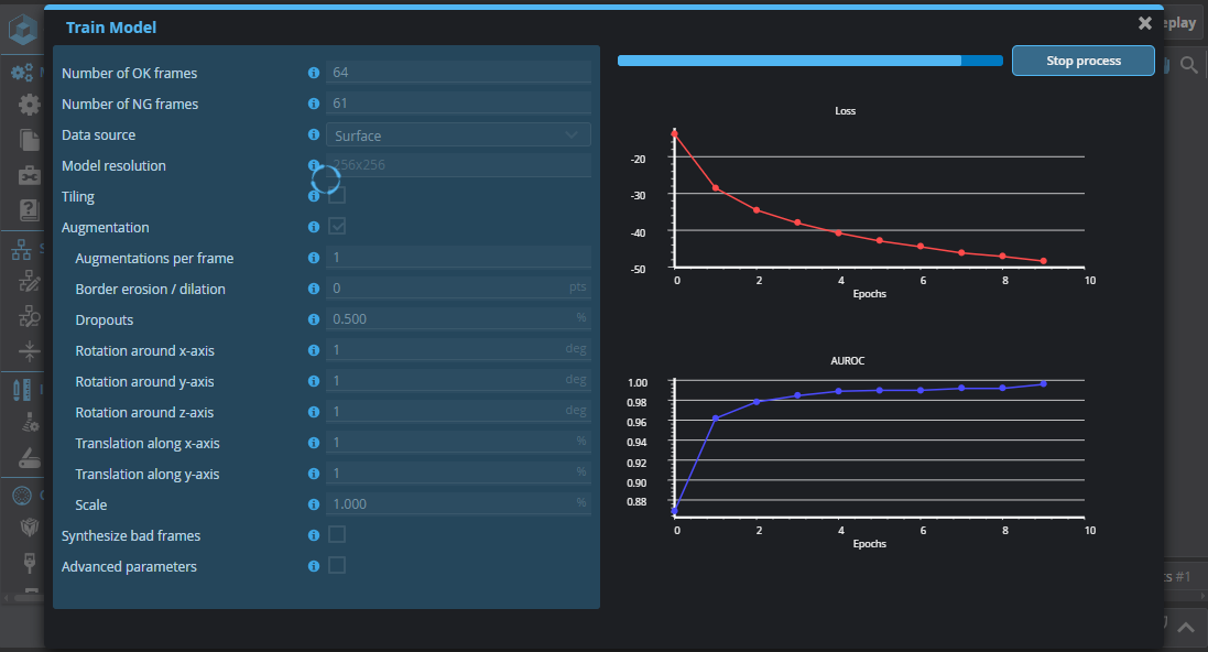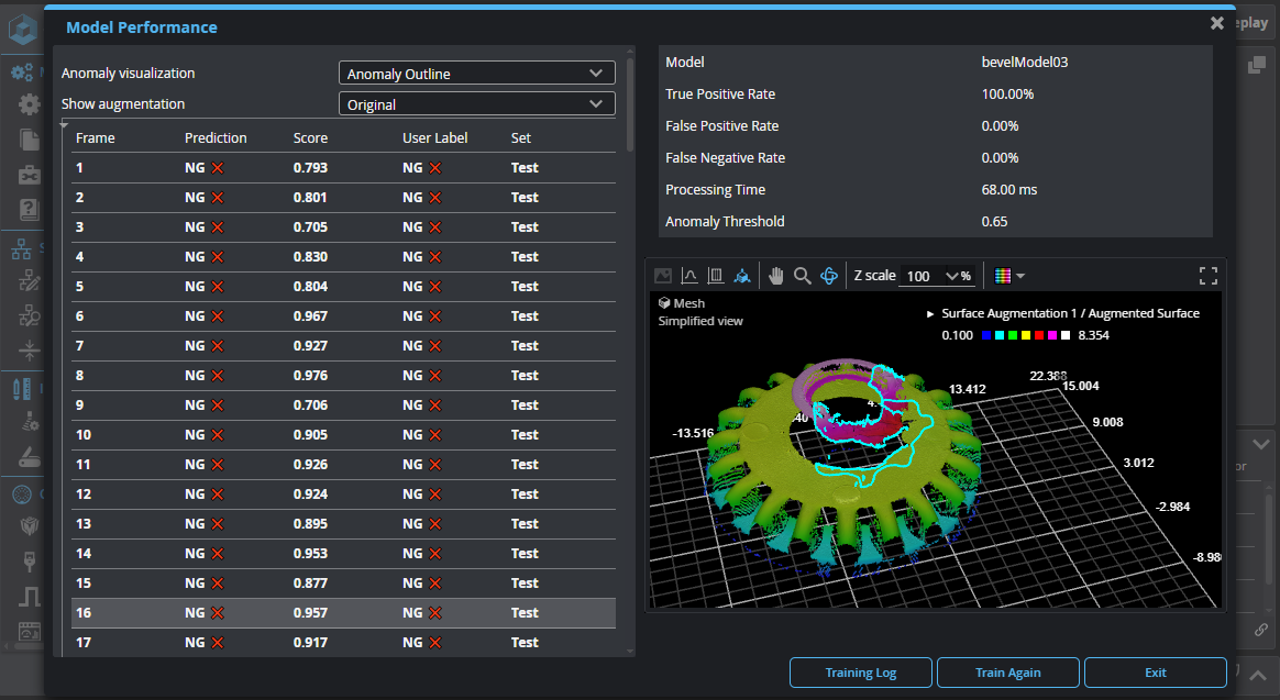 The Surface Anomaly Detector tool: This tool provides an AI-based model training routine and an inference engine that uses a trained model to predict whether something in production scan data is an anomaly. The training routine steps you through the process of training on "good" (OK) and "bad" (NG) example frames. The tool can also simulate part orientation and acquisition variations, as well as synthetic NG frames to improve model performance.