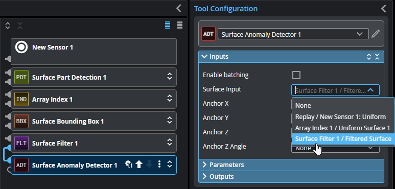 In the following the first four tools in the Tool Diagram on the left are the preprocessing tool chain. The last tool in the chain, Surface Filter, is used as input for the Anomaly Detector tool.