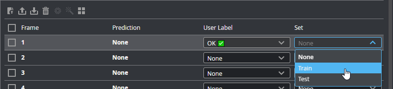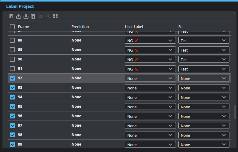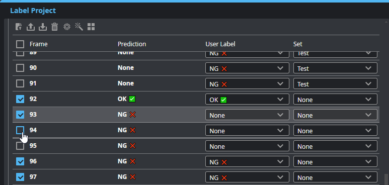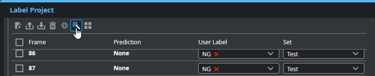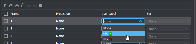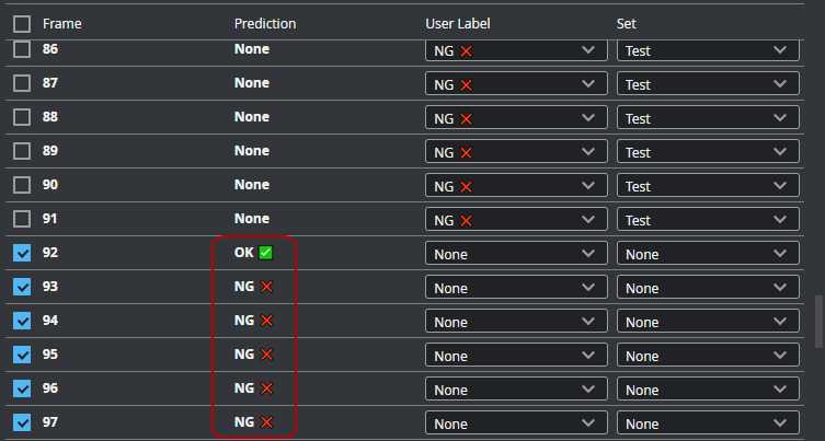 The tool uses the selected model to generate predictions (OK or NG) for the selected, unlabeled frames. Note that the user labels of the frames are unchanged at this point.