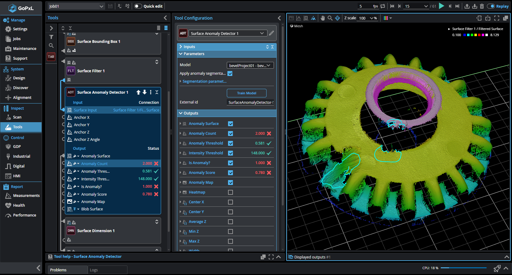 The GoPxL Anomaly Detector toolset, which is part of LMI's new GoPxL Pro Tools, lets you train and deploy AI-powered anomaly detection in parts and surfaces in scan data produced by a compatible Gocator sensor.