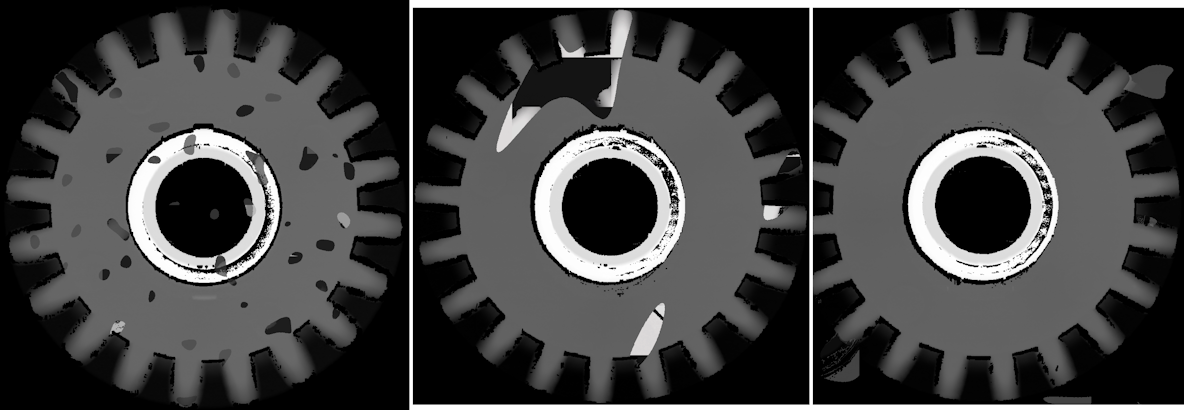 When this setting is enabled, the tool synthesizes bad (NG) frames from the good (OK) frames in the project. The frames are used internally during training and are not added to the frames in the project or shown in the tool. The following are examples of synthesized frames: