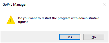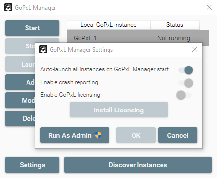 | 3. | Click Settings, and in the GoPxL Manager Settings dialog, click Run As Admin. |