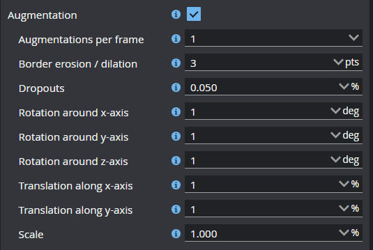 If you have enabled augmentations in the training configuration, you can use the Show augmentations drop-down to switch between a frame's original scan data and a simulated frame to get an idea of the effect of the augmentation settings. Note that the augmentations the tool shows are not the ones used in training, which are generated randomly during training using the provided ranges. Also, the score displayed in the selected row is the original frame's score, not the augmented frame. The following options are available:
