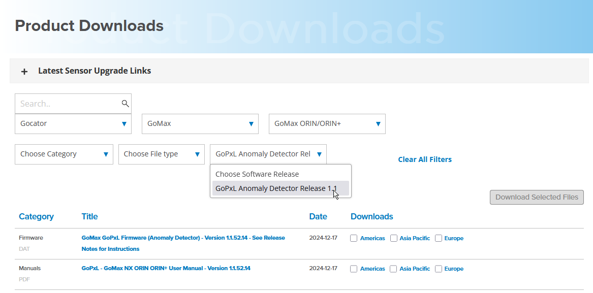 You can find the appropriate version of GoPxL on LMI's Product Downloads page (https://lmi3d.com/product-downloads/).For GoMax, choose "Gocator" as the Product Brand, and then choose GoMax under Product Family, and your model under "Product Series." Under "Choose Software Release," choose a release that specifies Anomaly Detector. Scroll to find the firmware.