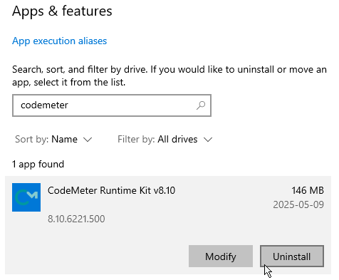 | 2. | In the "Search this list" field, type "codemeter", click CodeMeter Runtime Kit to expand it, click Uninstall, and follow the instructions. |