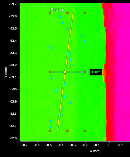 For the step on each path profile that matches the settings, the tool places an edge point between the upper and lower area (light blue diamonds in the interface). The tool then fits a line to those edge points (yellow line in the interface). You can choose the orientation of the paths around the Z axis to accommodate different edge orientations.