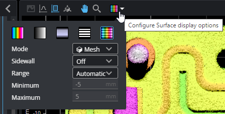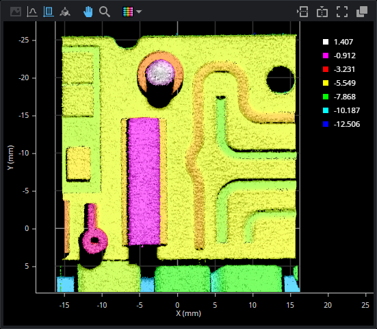 The data viewer displays heightmap information in pseudo-color or grayscale. The height axis (Z) is color-coded in the legend to the right in the data viewer. You can adjust the scaling of the height map using Range and its related settings.