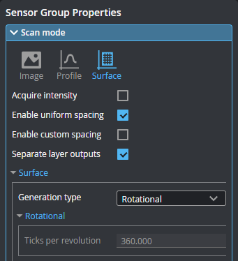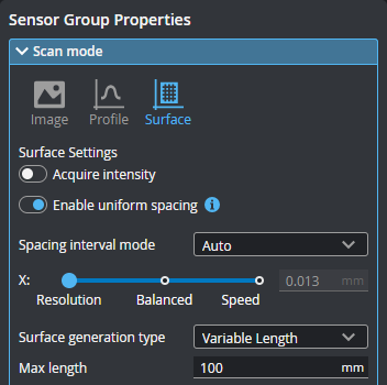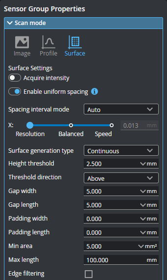 To use this method of surface generation, under Inspect > Scan, be sure to select Surface mode and configure the following parameters.