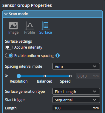 The sensor generates surfaces of a user-configurable fixed length. You must set the length and the start trigger the sensor uses to produce Surface data.