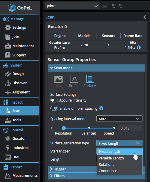 GoPxL provides different ways to generate Surface data, depending on the needs of your application. You configure these Surface generation methods in the Scan Mode section in the Inspect > Scan page. Four modes are available in Surface generation type: