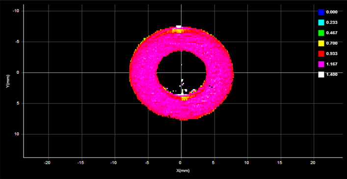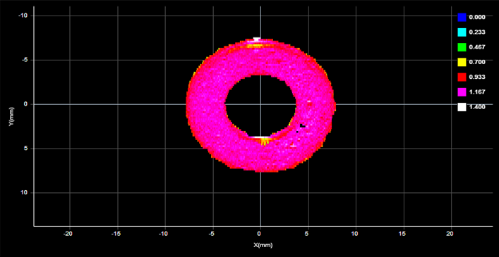 The sensor reorders profiles within a surface to be aligned with the encoder’s index pulse. That is, regardless of the radial position the sensor is started at, the generated surface always starts at the position of the index pulse. If the index pulse is not detected and the rotation circumference is met, the surface is dropped and the Encoder Index Drop indicator will be incremented. This mode is typically used in applications where measurements of circular objects or shafts need to be taken, such as tire tread inspection, or label positioning on bottles.