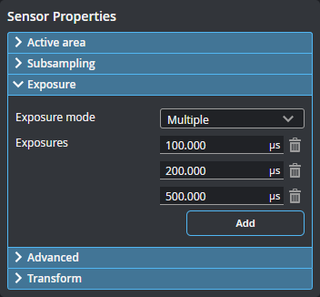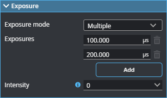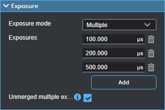 You can define up to five exposures (three for G3 sensors), with each set to a different exposure level. You add exposures using the Add button, and remove them using the trashcan icon.