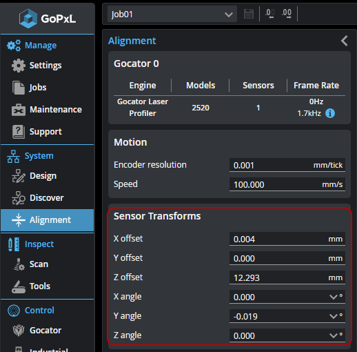 The transformation values determine how data is converted from unaligned coordinates to aligned coordinates (for an overview on coordinate systems, see Coordinate Systems). Transformation values are set automatically when you align a sensor using an alignment routine on the System > Alignment page.