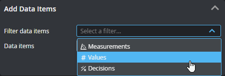 Lets you add sources (such as stamps or measurements) that GoPxL will send to the running HMI. Added connections appear in the Data Items section at the bottom of the panel. If you have many measurements, you can filter them by type to make it easier to find the item you want in the Data Item drop-down. You can enable more than one filter.