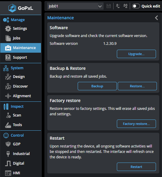 - Backup / Restore...: Back up and restore all saved jobs and recorded data. Note that backing up and restoring on a PC instance of GoPxL only affects the PC instance, not the sensor. For more information, see Backup and Restore.