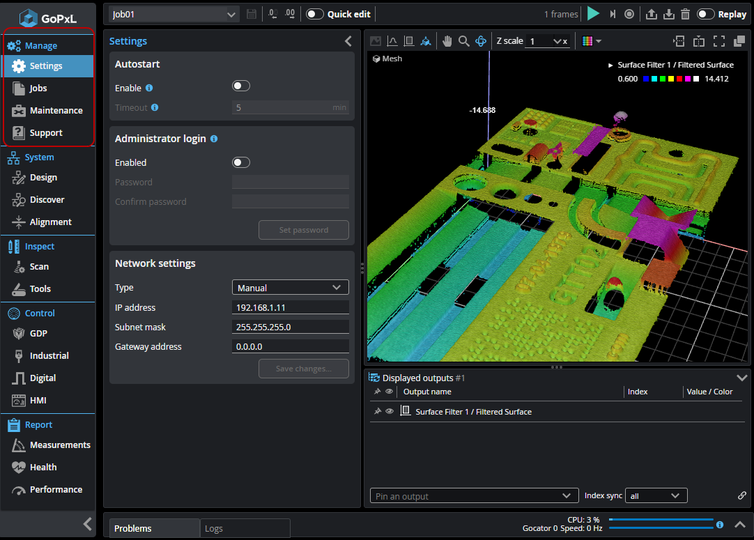 The Support page provides software version information and lets you download a support file for troubleshooting; it also lets you upload a support file to GoPxL. You can also access and download the GoPxL documentation, download the SDK, and go to LMI's online support page. For more information, see Support. |