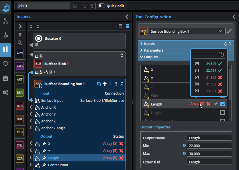 The following shows the Surface Bounding Box tool in batching mode (taking the Surface Blob tool's array of outputs as input). The tool calculates the bounding box for each element in the input array, and returns the enabled measurements as arrays. That is, it returns an X, Y, and Z measurement for each object.