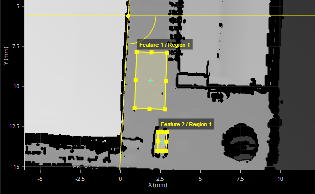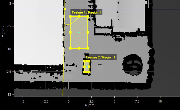 Gocator’s “Feature” tools (such as Feature Dimension and Feature Intersect) use geometric features as inputs. For example, because the point geometric feature representing the center of a hole has X, Y, and Z components, you can perform dimensional measurements between it and another geometric feature, such as another hole or an edge. The Feature Create tool takes one or more geometric features as input and generates new geometric features (for example, creating a line from two point geometric features). You can then perform measurements on those features directly in the tool or in other Feature measurement tools. You can also use angle measurements on the newly created features for anchoring. For more information on Feature tools, see Feature Measurement.