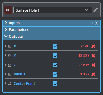 Many of GoPxL’s measurement tools can output data structures such as points, lines, planes, and circles. These structures are called geometric features and contain the components you would expect: a point geometric feature contains X, Y, and Z components (representing the location of the point in 3D space). Examples of point geometric features output by Gocator’s measurement tools are hole center points, the tip and base of studs, or a position on a surface.