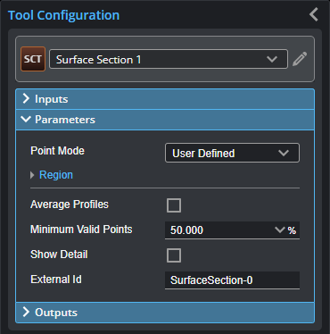 Selects how the tool defines the end points of the section. One of the following: User-Defined: Enables a region (see Region below) whose size, position, and rotation you define. The section is placed along the X axis in the middle of the region. Feature Points: Uses two Point geometric feature inputs as the end points of the section. |