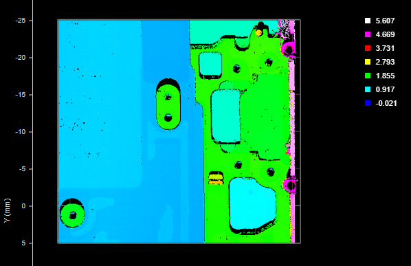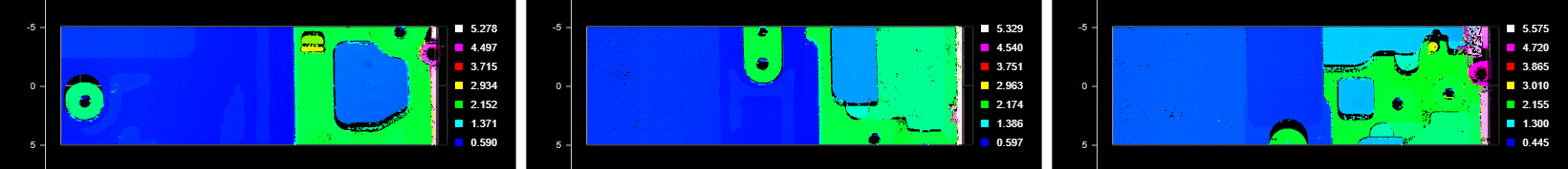 The Stitch tool lets you combine up to 24 frames of scans into a single Surface scan. This lets you get a much larger scan volume with fewer sensors (either in a single sensor system or a multi-sensor system). For each scan, you can specify not only X, Y, and Z offsets (translations), but also X, Y, and Z angles (rotations), defining its relationship with the others. This means that when the sensor system is mounted to a robot, or if you are using, for example, an X-Y table, you can get a complete scan with fewer sensors. The resulting combined scan can then be used as input by any other Surface or Feature tool from its Surface Input drop-down.