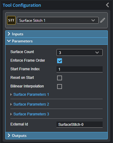 The number of scans to combine into a single surface. For each, a "Surface Parameters" section is added. The tool accepts setting the number of scans to one: in this case it, behaves like a transform tool.