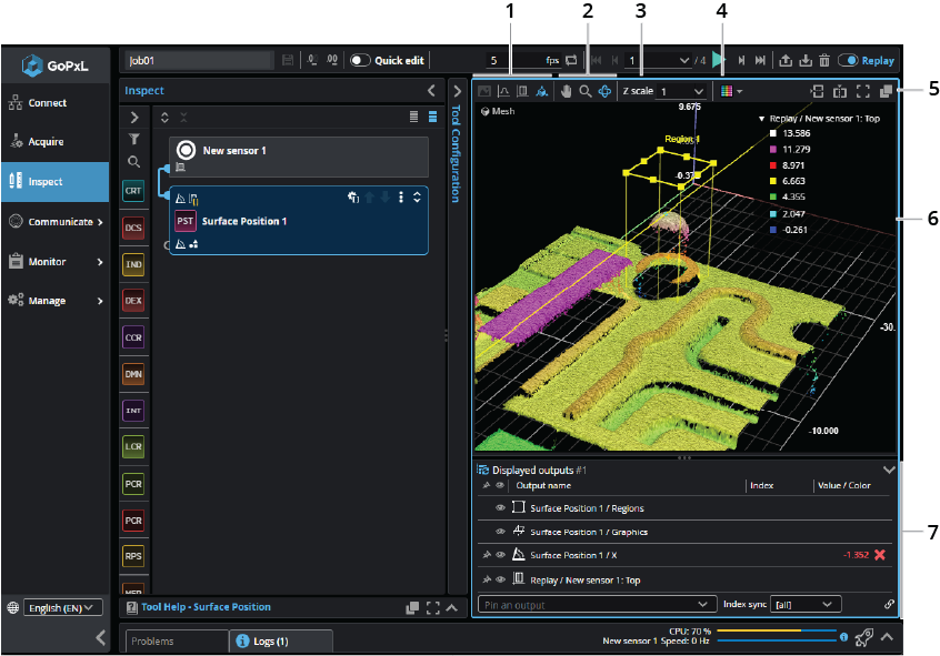 You use a data viewer to observe scan data (such as Profile and Surface data), as well as video images and intensity images. You can also use it to configure measurement tools (see Inspect - Measurement and Processing) and a sensor's active area (see Active Area). GoPxL supports multiple data viewers (via both splitting and pop-out buttons).