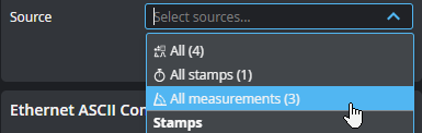 Lets you add sources (such as stamps or measurements) in the connection map. Added connections appear in the Ethernet ASCII Connections at the bottom of the panel. If you have many sources, you can filter them by type to make it easier to find the source you want in the Source drop-down. You can select more than one filter at once.