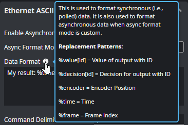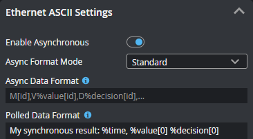 The Ethernet ASCII protocol provides several settings you must configure. The settings that are displayed change depending on the operation mode (polling vs. asynchronous) and the format mode.