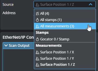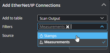 Lets you add sources (such as stamps or measurements) to send over the protocol. Added connections appear in the EtherNet/IP Connections section at the bottom of the panel. When GoPxL is running on a standalone sensor (one not controlling others), Add to Table only contains one value (Scan Output) that represents a register assembly. When GoPxL is running on a sensor controlling other sensors, or on a PC or GoMax NX, Add to Table contains an additional entry (Sensor Group State). Use this to choose which register a source is added to. If you have many sources, you can filter them by type to make it easier to find the source you want in the Source drop-down . You can enable more than one filter.