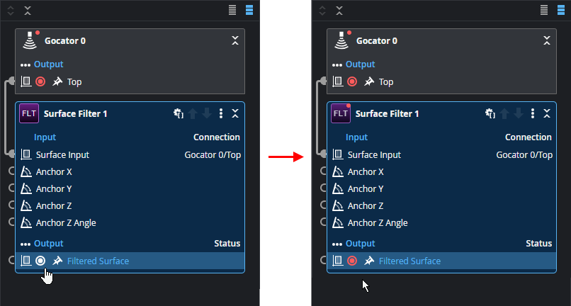 You can also record a tool's output. An example of this is recording the Filtered Surface output of a Surface Filter tool. To do this, first enable recording above the data viewer as you would normally do. Then, expand a tool in the Tool Diagram, and click the white Record button next to an output.