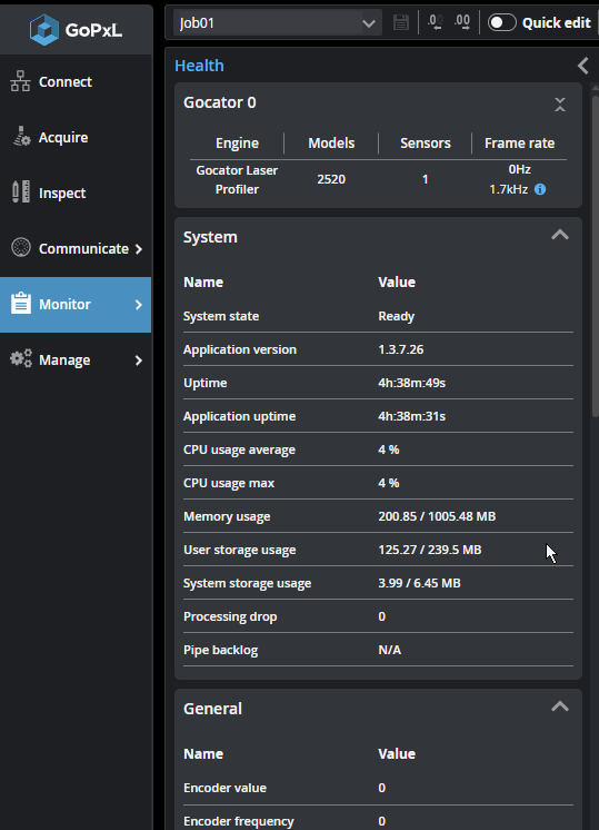 When a sensor is being accelerated (by a PC instance of GoPxL or by GoMax), the value reported in the System section comes from the accelerator. However, only the following metrics are appreciably different from the physical device when accelerated: Uptime, CPU Usage, Memory Usage, and System/User Storage Usage.