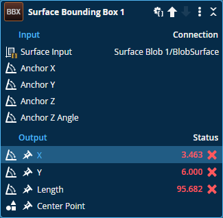 The following shows the Surface Bounding Box tool in batching mode (taking the Surface Blob tool's array of outputs as input). The tool calculates the bounding box for each element in the input array, and returns the enabled measurements as arrays. That is, it returns an X, Y, and Z measurement for each object.