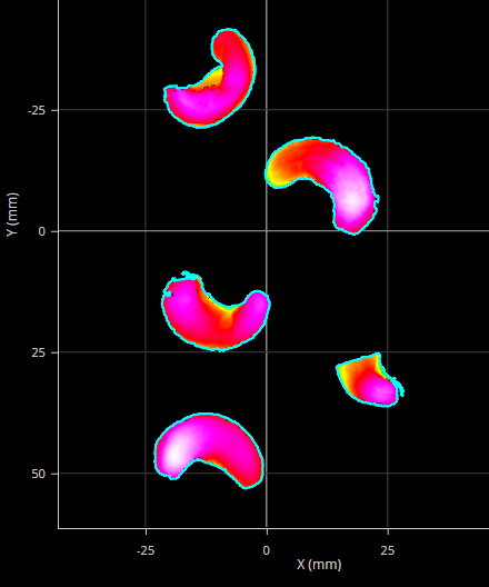 The Surface Blob, Surface Segmentation, and Surface Pattern Matching tools can identify multiple occurrences of features or parts in scan data. When you check Enable Array Output in the tool's Parameters section, the tool outputs an array containing the occurrences. Otherwise, the tools produce a separate output for each identified feature or part. In the following, a Surface Blob tool has identified five blobs in scan data.