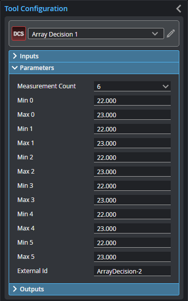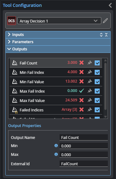 The Array Decision tool takes an array of measurements as input and applies individual minimum / maximum thresholds to one or more of the array elements. The tool returns results related to fails (number of fails, index and value of max/min fail, as well as arrays of failed measurements and their indices).