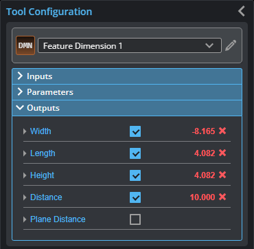 The Feature Dimension tool returns dimensional measurements from a point geometric feature to a reference point, line, or plane geometric feature. Geometric features are available as outputs from many tools, for example a Point geometric feature from Surface Position, or a line from Surface Edge. The feature creation tools such as Feature Circle Create, Feature Line Create, and so on, can also create geometric feature. For more information on geometric features, see Geometric Features.