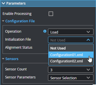 A drop-down that display the settings of the selected sensor. For descriptions of the individual sensor parameters used for the alignment, see Sensor Parameters. |