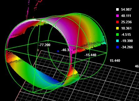 The Surface Cylinder fits a cylinder to scan data and returns measurements and geometric features related to the fitted cylinder. Unlike the Surface Stud tool, the Surface Cylinder tool does not rely on a flat surface perpendicular to the cylindrical object. Examples uses of the tool include fitting to the outside of a cylinder and fitting inside a drilled hole.
