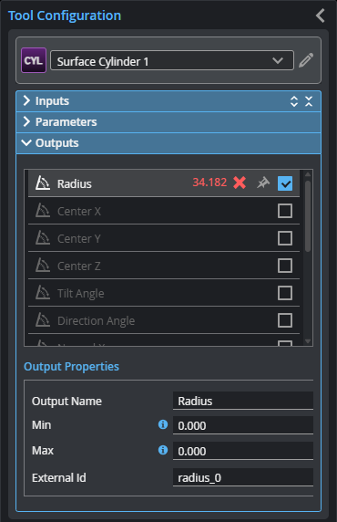 To set what measurement values are considered a Pass, select a measurement in the Outputs list and configure its Min and Max parameters in the Output Properties section. To return a Pass decision, the measurement must be between the maximum and minimum values; the range is inclusive.
