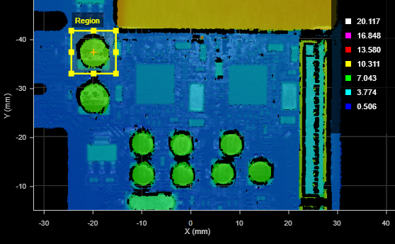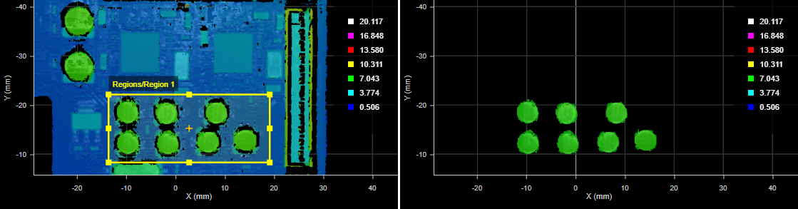 Other measurement tools can then be placed over the capacitors, without needing to anchor them. In the following image (the third frame, which was significantly shifted and rotated), a Surface Filter tool isolates the capacitors based on height. Subsequent tools can perform measurements on the isolated data to verify that all capacitors are present, are seated properly, and so on.